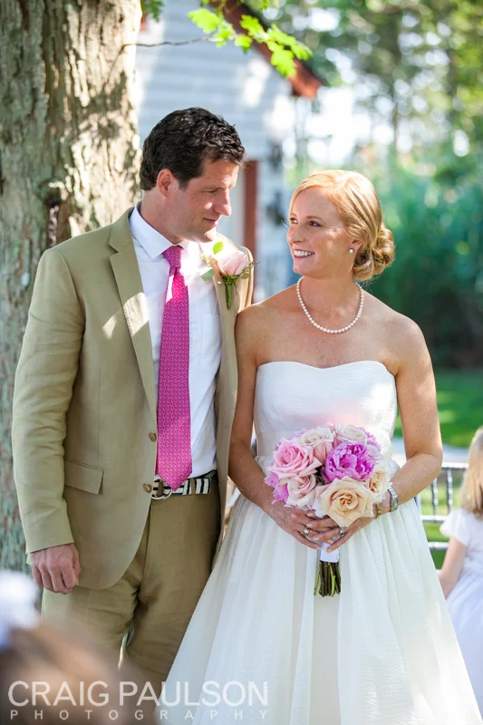Erin & Luke were such a laid back couple. Already technically married and new parents of an adorable baby boy, these two were ready to party and celebrate with all their close friends and family. They chose a their wonderful home out on the north fork of Long Island in Cutchogue, complete with sunset ocean views and lots of greenery. Erin donned a beautiful lacy dress (with pockets!) and her mother’s pearl necklace that made her stunning features just glow. Luke wore a nice tan suit with a bright tie to match the look and feel of the day. Accompanied by all their nieces as their wedding party, the two had a sweet and simple ceremony in the garden, then after an awesome cocktail hour and tented party! They finished the night with fireworks on the beach to wrap up the perfect way to celebrate a marriage!