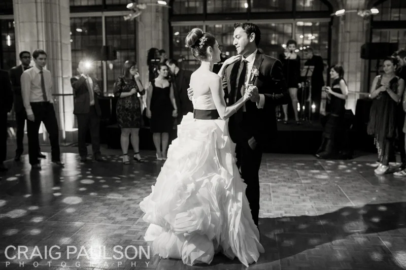 We met Danielle at the Mandarin Oriental Hotel,where she got ready and put on her intricate gown by Maggie Sottero. The groom, Rajiv, put his suit and other finishing touches on at his apartment. The couple had their first look at each other on the hotel’s rooftop garden, with the city skyline behind them. Just before the ceremony, we took the couple to Grand Central for a little photo shoot, where they had fun posing and running around, all while being observed by the smiling faces of strangers in the area. Danielle and Rajiv then made their way to Guastavino’s for the ceremony and reception. The couple made their ceremony unique by incorporating two special traditions – walking around fire, which is an Indian tradition, and the breaking of glass, which is Jewish. The beautiful flower arrangements were provided by H Bloom. After saying “I do”, the party moved to the dance floor, where guests enjoyed music by Jerry Kravat. The entire scene was lit by the warm glows of candlelight and ethereal purple lighting – it was a magical night full of dancing and happiness.