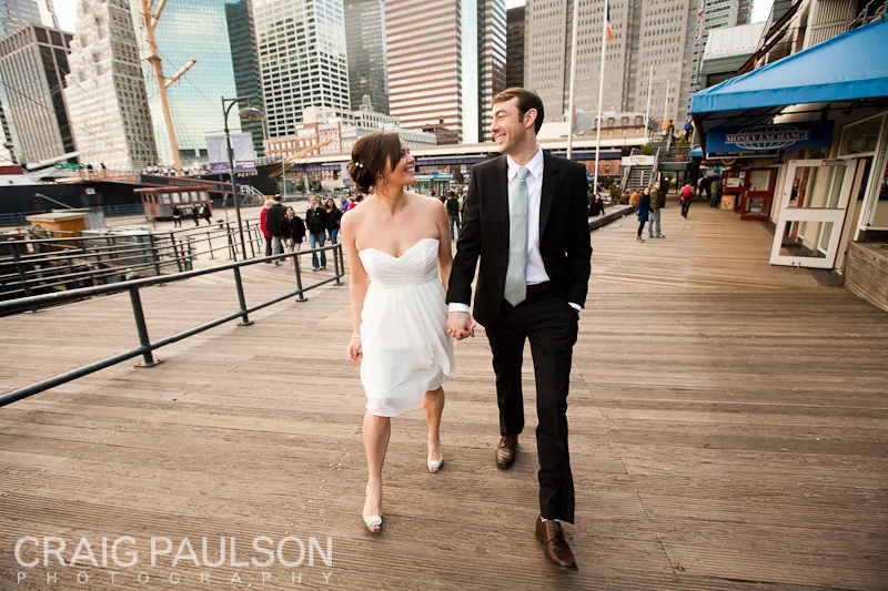 Nina and John had a lovely small wedding at a restaurant in New York, complete with a surprise ceremony for their guests who knew they would be celebrating Nina and John’s marriage but didn’t know that it would actually be happening before their eyes. Before the party, they went around the South Street Seaport for some couples portraits, in spite of there being a bit of a chill in the air.